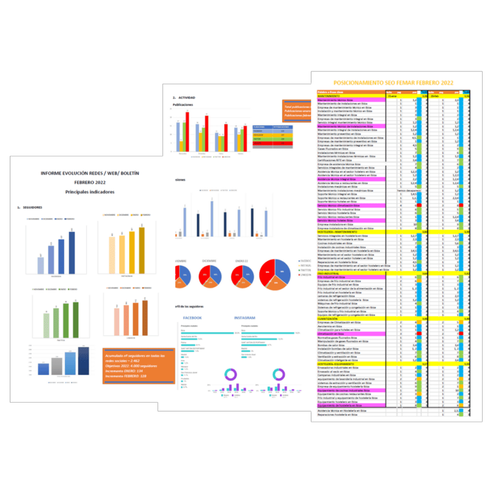 Desarrollo de páginas y perfiles, creación de comunidades, incremento de seguidores, elaboración y publicación de posts, anuncios y campañas B2B. Análisis y medición.